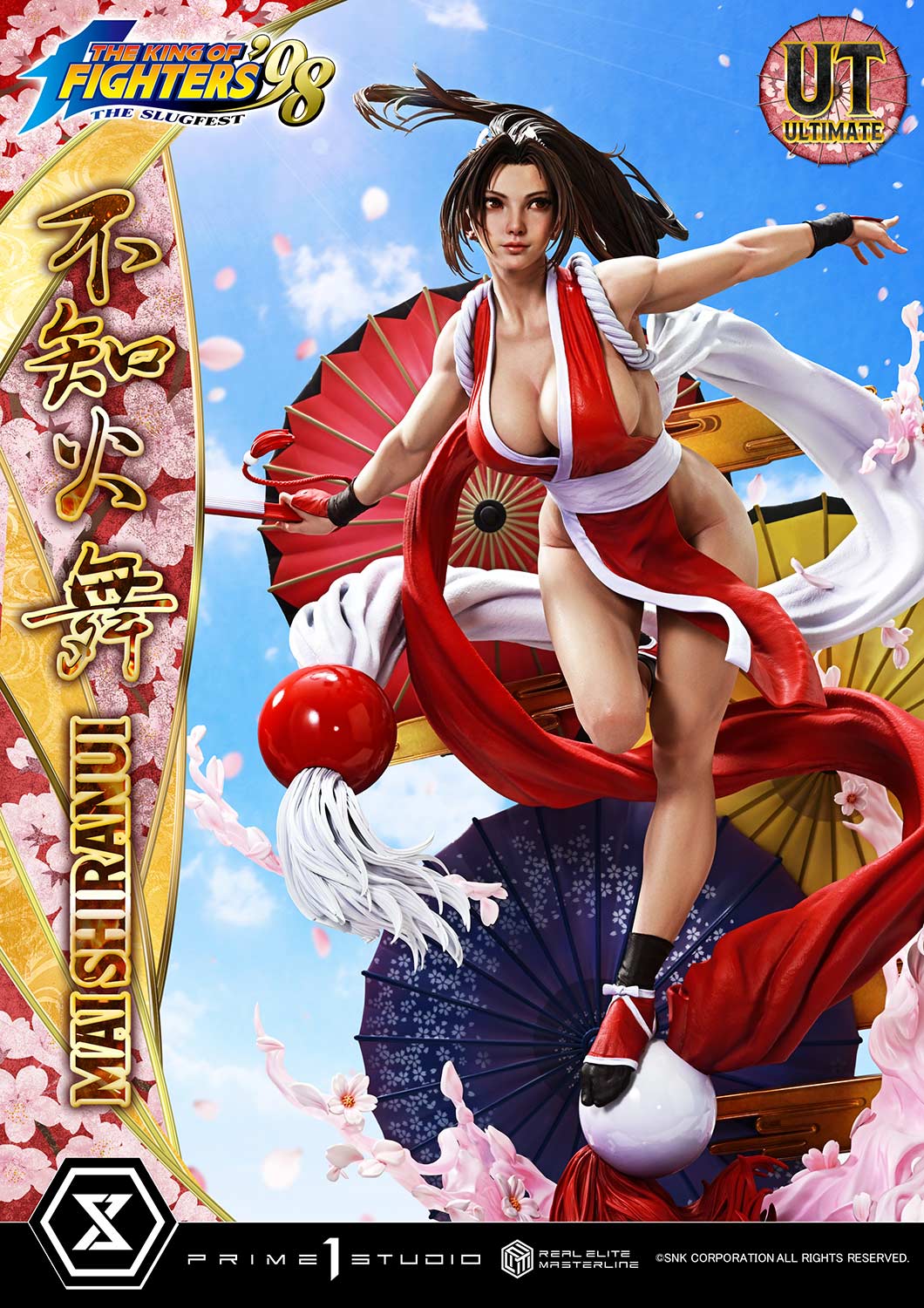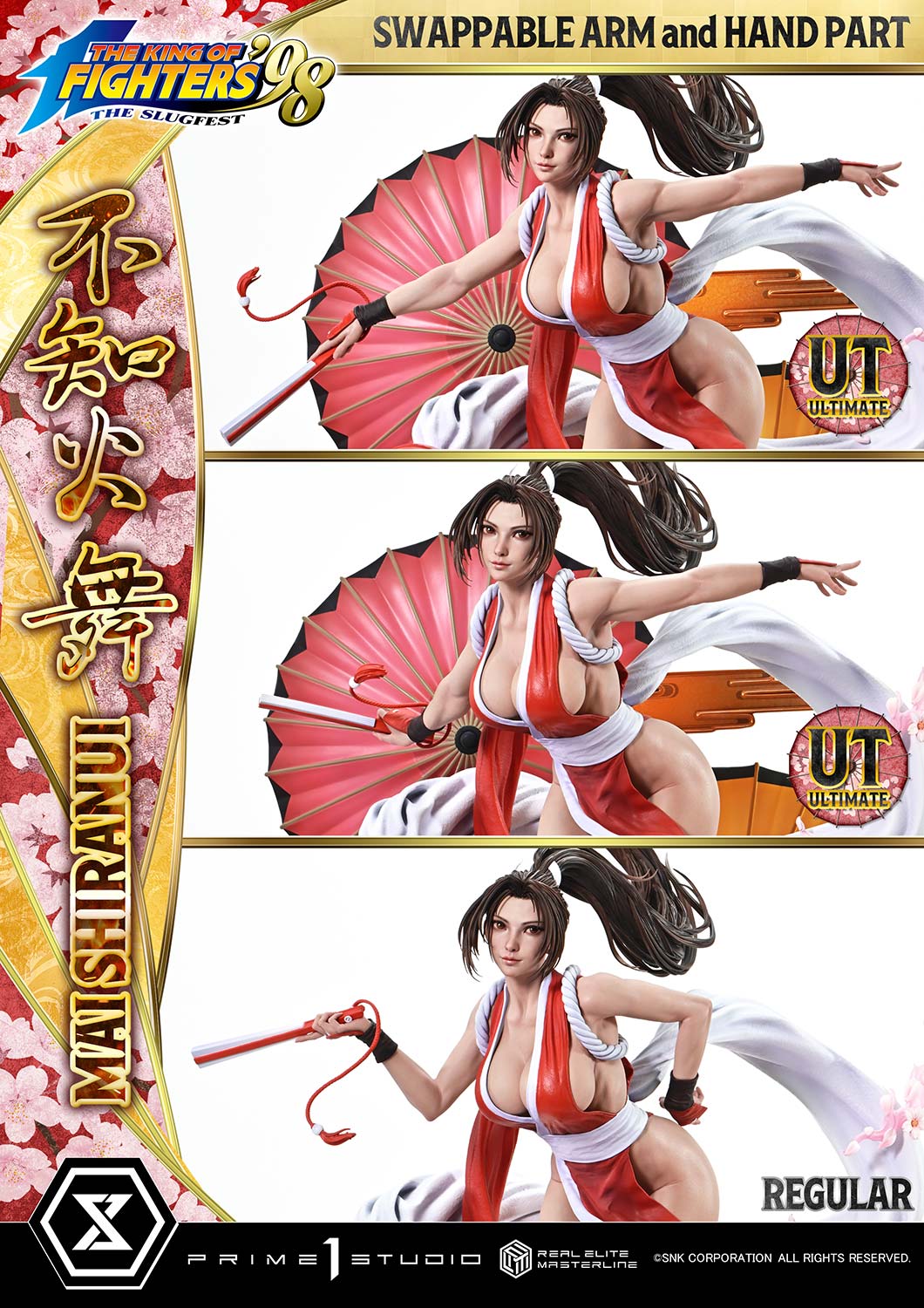 終極版=拳皇’98主題底座+右臂配件×3(彎曲手肘/前斜向/後斜向)+右手配件 ×1(後斜向姿勢:握扇、閉合)+左臂配件×2(置於腰間/後斜向)+左手配件 ×1(後斜向姿勢:張開手掌)+背景支架